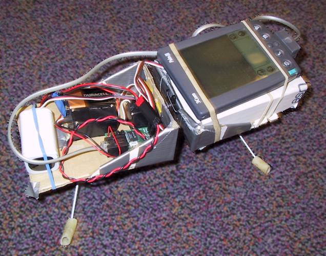 Constuction: Corrogated cardboard frame. Three Futaba S-148 R/C servos. Scott Edwards Serial Servo Controller card. Futaba 4.8v Nicad battery pack (for servos), 9v batt (for SSC), homemade RJ11m to Palm Hotsync cable, PalmIII.