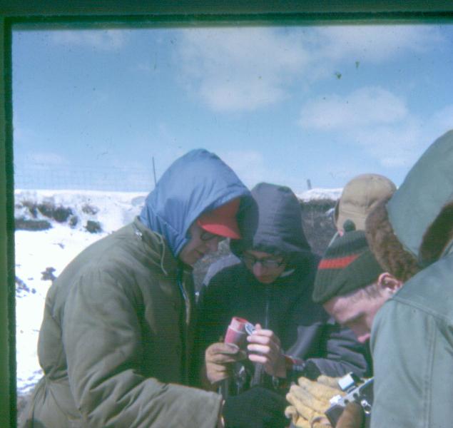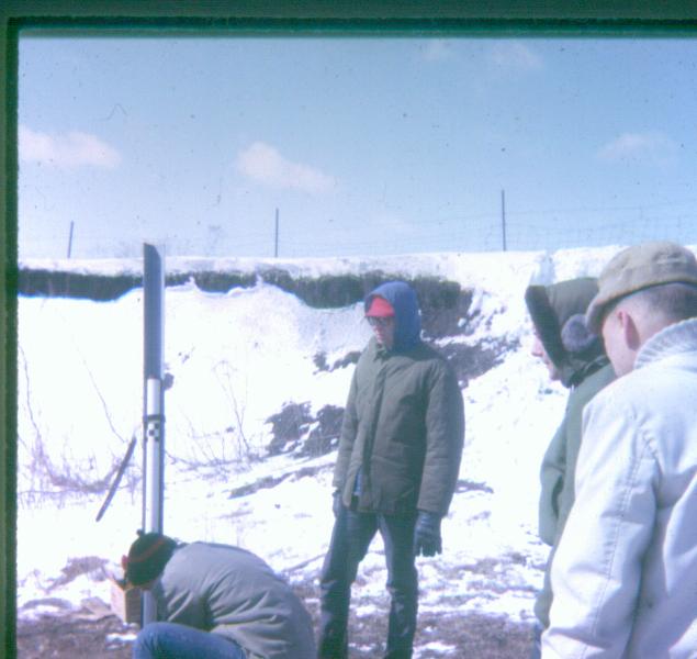 Duane's slide of rocket prep: Duane at rocket, with Alan Anderson and 2 other spectators(who?).