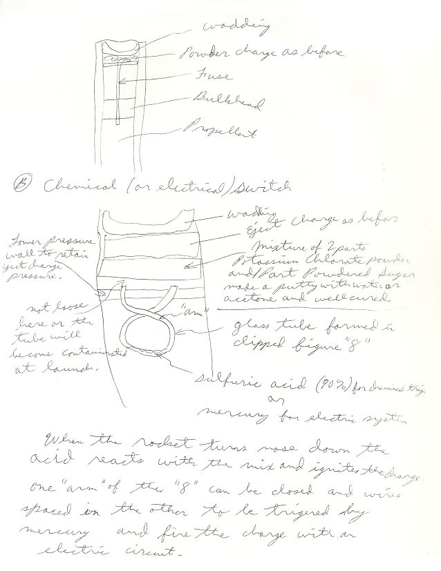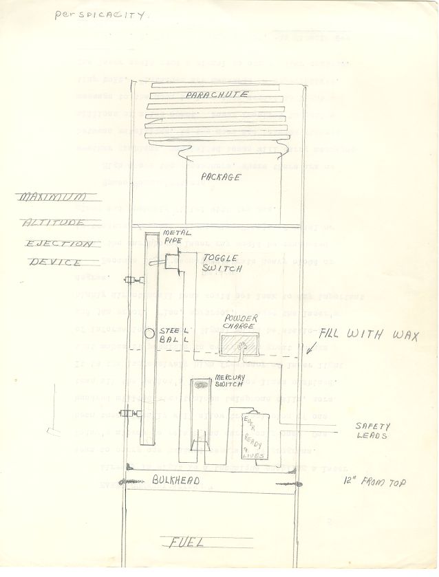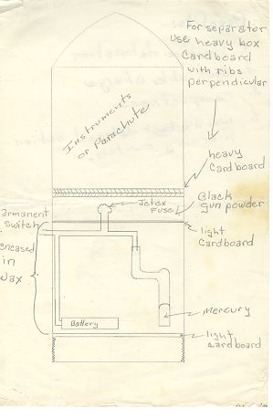 Keith built the parachute deployment device. Initiated by sulfuric acid droped from a gamma-shaped glass tube onto a cast waffer of ??? to ignite a