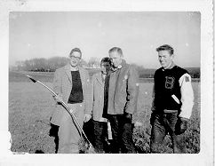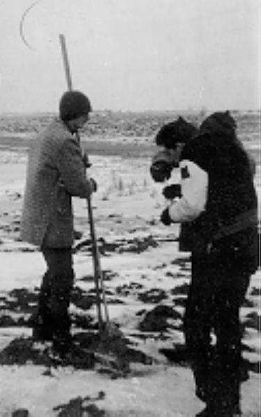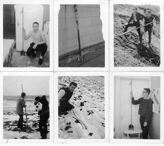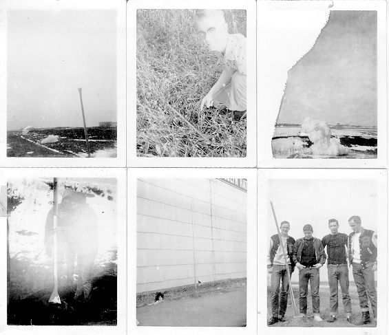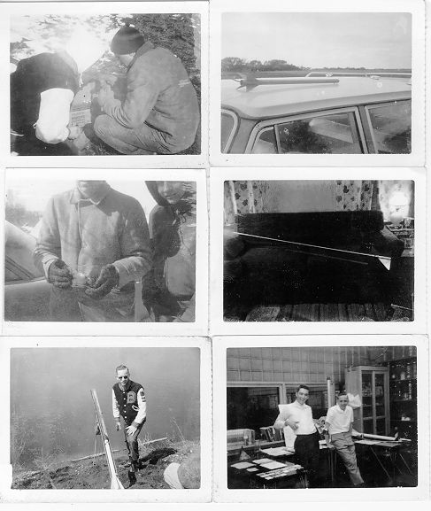 Post-Flight: 10. Photo17e.jpg John, Claire, Duane, Kieth with "Essai On" post-launch. Rocket bent on landing. 12/16/62
