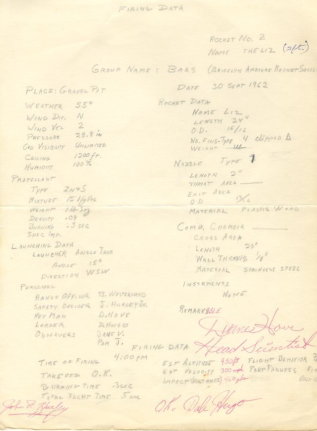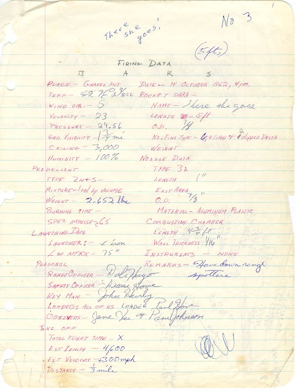 Launch : 09/30/62 Alt: 150 yrds, dist: 460 yds, velocity: 120 mph