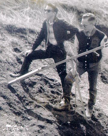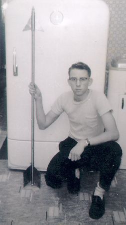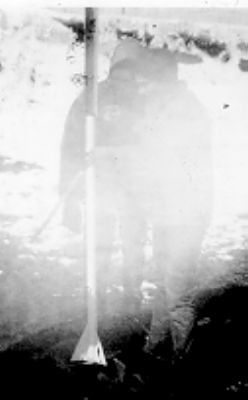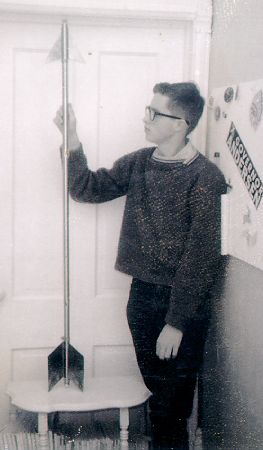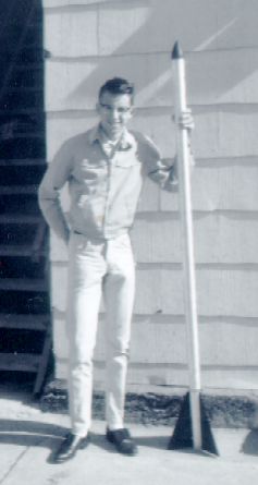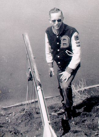 Pre-Flight : 5. Photo20g.jpg Duane with "Lady Luck"? and Mr. Lucky? (since other trapezoid finned rocket, "There She Goes" would have been lost the previous month.) 12/1/62