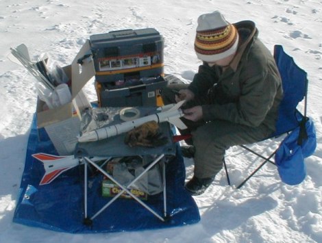 | Jeff | Centuri Orion | Aerotech D13-4W 18mmRMS | Glen's 14" nylon chute | 1200 | Winds picked way up. Perfect, loud launch and deployment. But drifted off-range and landed in tree. Glen and Mark helped get it down with a pole. Tree extraction caused damage: shock cord ripped off, body tube zippered, broke one fin, broke two pods, one pod lost. I searched the snow and the whole range and didn't find it. Left address with homeowner in case it shows up this spring. |